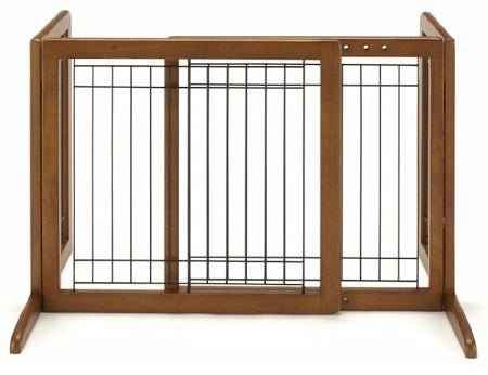 Made from elegant hardwoods, this free-standing pet gate folds up when not in use. This space-saving design allows for easy storage in your home or car. The Bay Isle Pet Gate has wide legs so it completely self-supporting and won't get pushed over by your pet.